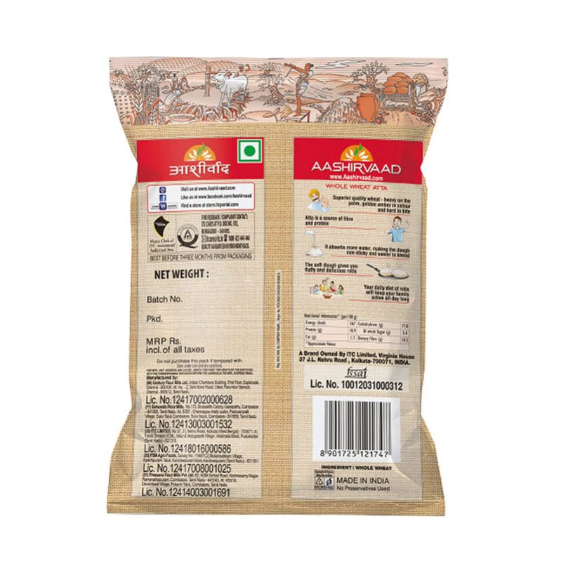 Aashirvaad Shudh Chakki Atta is India's No. 1 atta brand. The 4-step advantage process of sourcing, cleaning, grinding & no-touch packaging ensures zero human contact. 100% pure whole wheat atta with all its natural dietary fibres intact. Sourced from a wide network of rural farmers, it is Made in India. The grains go through a 3-step cleaning process & �chakki-grinding� which ensures it contains 100% Sampoorna Atta & 0% Maida. The locked-in dietary fibres & nutrients help improve digestion & immunity. The dough absorbs more water keeping the rotis soft for a longer period. Aashirvaad Shudh Chakki Atta is made using the 4-step advantage process of sourcing, cleaning, grinding & contactless packaging Wheat is sourced from 6500+ selection centers across India Wheat grains are cleaned thrice The chakki-grinding process ensures it contains 0% Maida and 100% Sampoorna Atta The atta remains untouched because of the mechanised packaging Aashirvaad Shudh Chakki Atta is India's No.1 Atta Brand